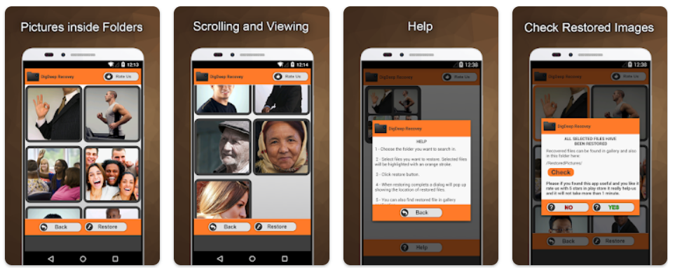DigDeep Image Recovery es una herramienta eficaz para recuperar imágenes eliminadas en formatos PNG, JPEG o JPG. Esta aplicación escanea la memoria interna del dispositivo en busca de fotos borradas, permitiendo restaurarlas fácilmente.